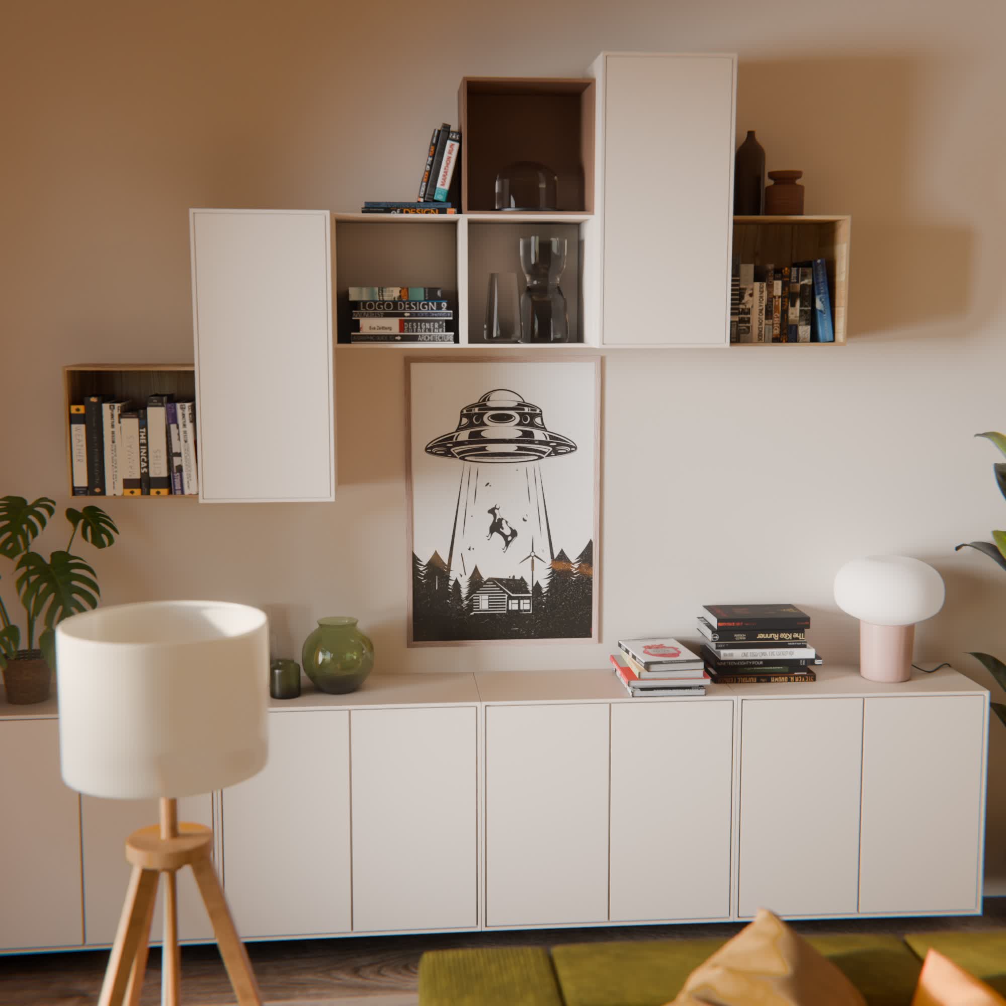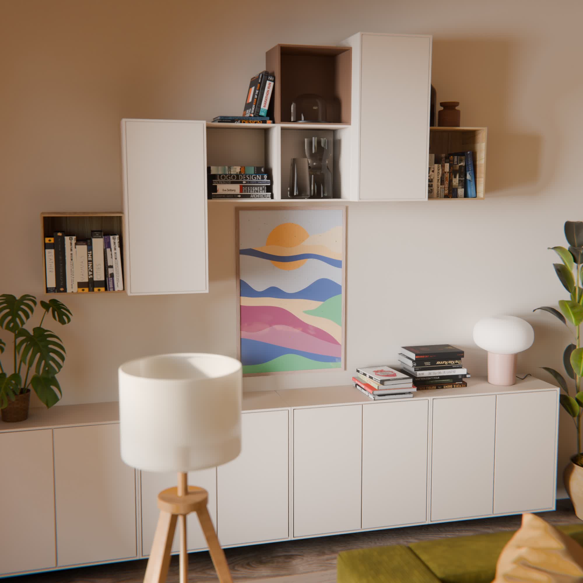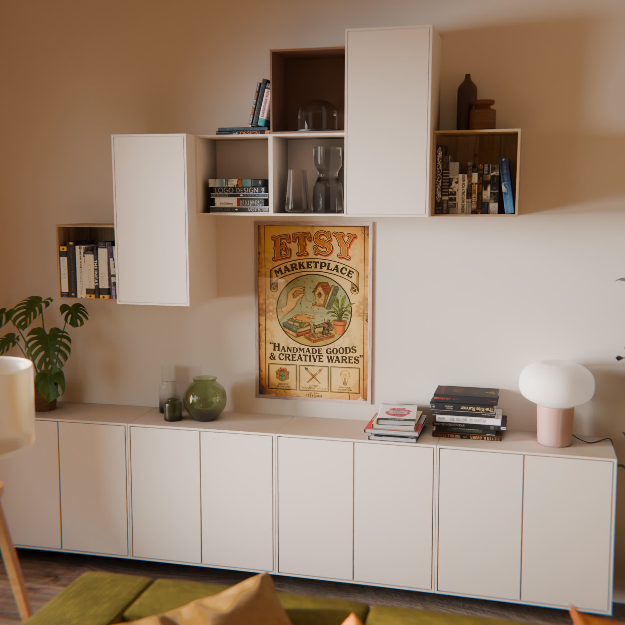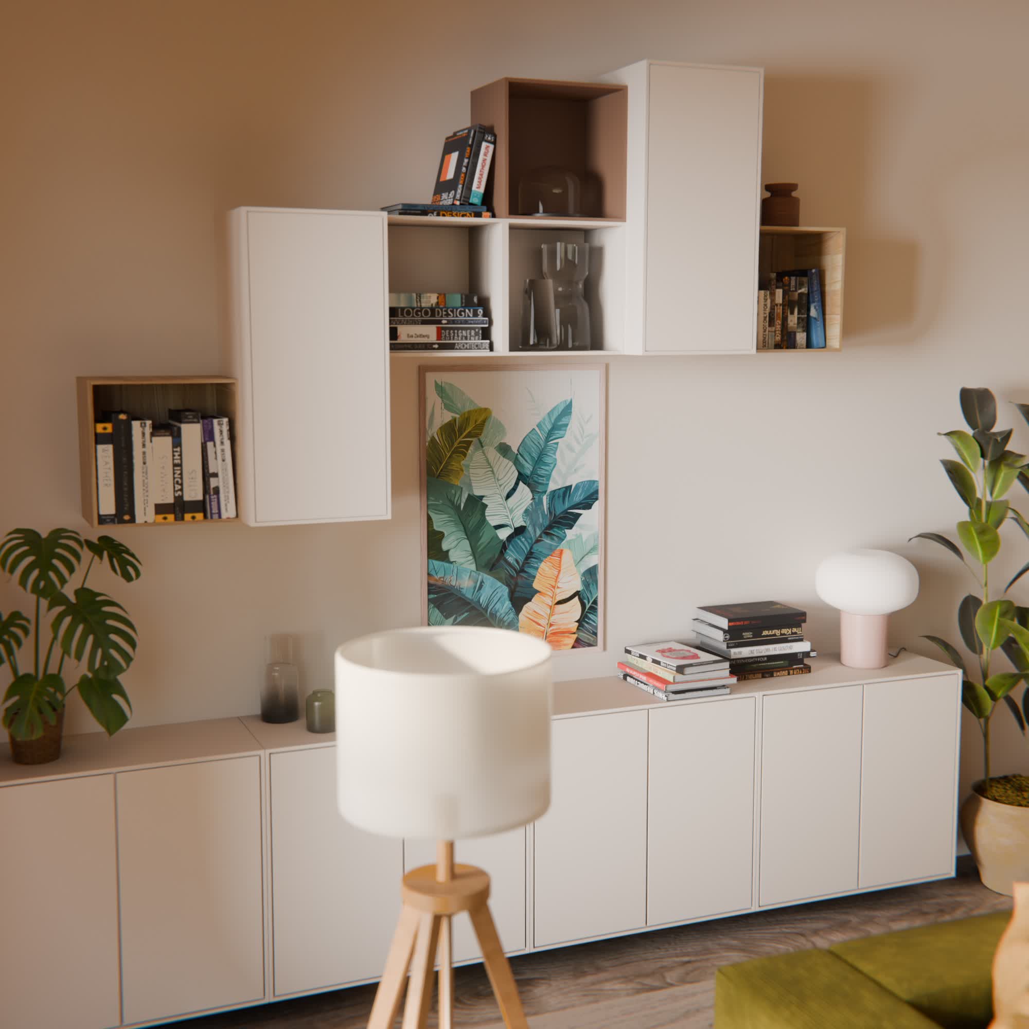Imagine your art displayed in a serene, modern living space. This video mockup captures soft, natural light illuminating a clean design, featuring white shelving, light wood accents, and a touch of greenery. The cozy, minimalist aesthetic provides an ideal backdrop for showcasing your designs with authenticity.